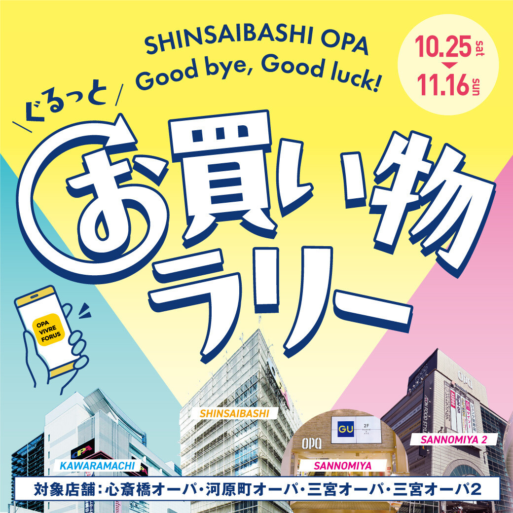 <心斎橋オーパ2026年1月12日閉館に伴う特別キャンペーン開催!!> OPA VIVRE FORUSアプリを提示して、関西エリアの対象店舗でお買い物! 心斎橋オーパを含む2店舗以上で、1店舗あたり税込2,000円(合算可)以上お買い上げいただくと、 お買い物した店舗数×1,000円分(500円×2枚)のショッピングチケットをプレゼント! さらに、期間中に対象のすべてのオーパでお買い上げいただいた方から 抽選で10名さまに、心斎橋オーパ オリジナルグッズをプレゼント! 【実 施 期 間】10月25日(土)~11月16日(日) 【対 象 施 設】心斎橋オーパ 河原町オーパ 三宮オーパ 三宮オーパ2 【ショッピングチケット進呈日】2025年11月19日(水) 正午 【ショッピングチケット有効期限】2026年1月12日(月・祝) ※一部対象外のショップ・サービスがございます。 ※電子マネー・プリペイドカードへのチャージや、商品券・ギフトカードなどの金券類のご購入は対象外となります。 ※景品進呈は各館でおひとりさま1回限りとなります。 ※チケットは税込500円ごとに1枚ご利用いただけます。 【オリジナルグッズ引き換え場所】 心斎橋オーパ本館1Fオーパカウンター ※当選された方には11月19日(水)までにOPA VIVRE FORUSアプリクーポンを進呈いたします。 ※オリジナルグッズセットの引き換えにはアプリクーポンが必要です。 ※三宮オーパでは引き換えを実施しておりませんのでご注意ください。